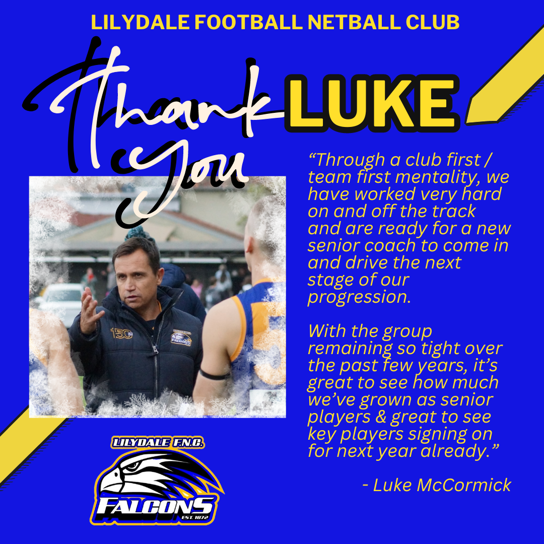 The Lilydale Football Netball Club would like to inform our community, that Luke McCormick & Jesse Bertram have decided to step down as Senior Coach, and Senior Assistant Coach respectively, at the conclusion of the 2024 season.